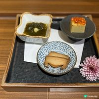 各款菜單中的前菜及茶碗蒸蛋會按季節而更替,適逢開業正值初夏,前菜或包羅肉質飽滿的「北海道蝦夷鮑魚」、爽脆鮮甜的「螢光魷魚」、惹味誘人的「慢煮鴨胸配日本分蔥醬」及「嫩豆腐佐蠶豆及日本蕃茄」等;「和風茶碗蒸」則以時令食材如松葉蟹配櫻花鹽漬入饌,充滿春日氣息。