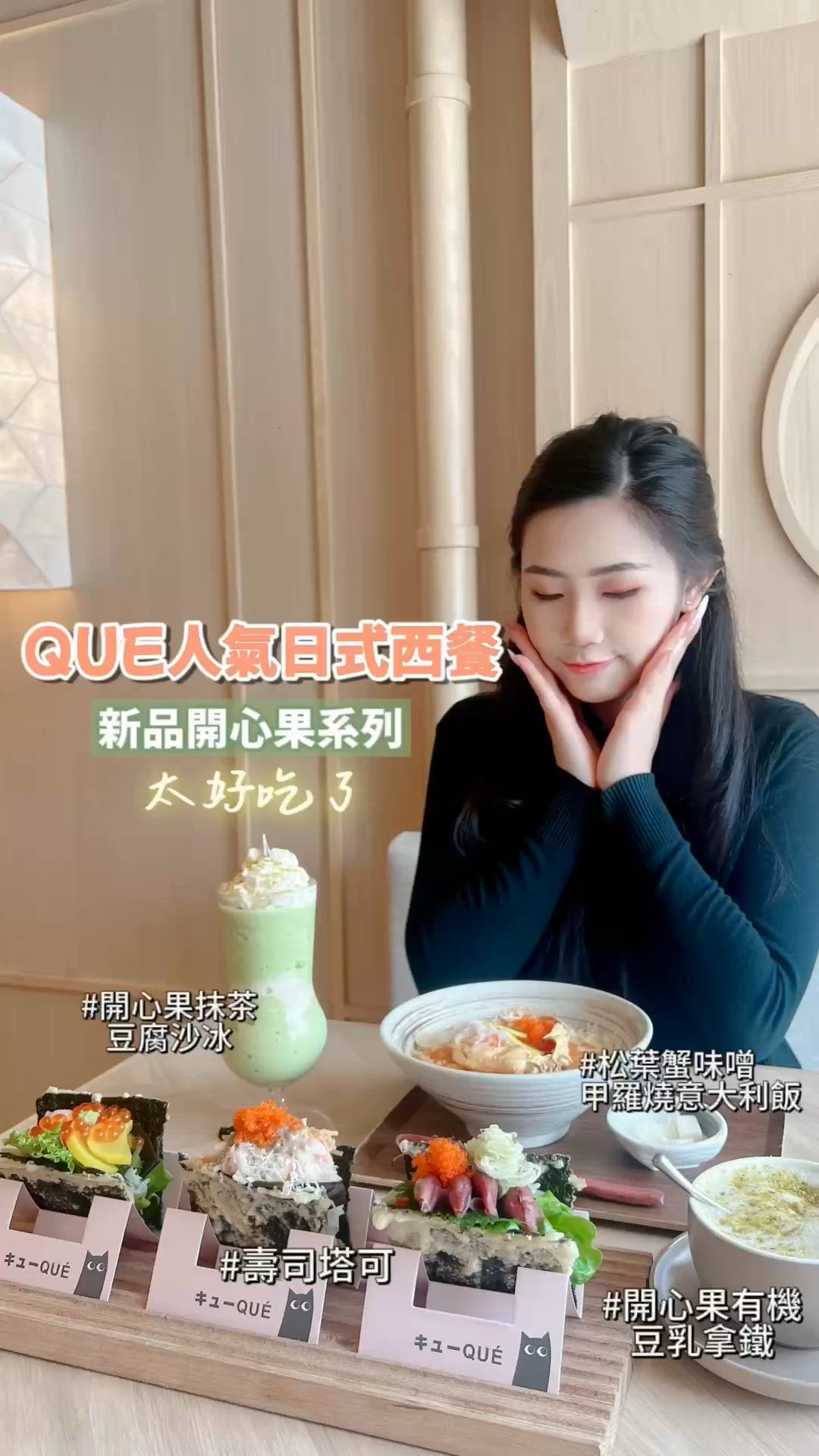 快到母親節了,大家想好去哪裡慶祝了嗎?經過朋友推介,找到了一間CP值超高的日式西餐:QUE,食店環境以日系木色為主題,給人乾淨又溫馨的感覺💕而且餐廳是由得獎日籍主廚Rin Horiuchi主理的西日fusion cafe,絕對有品質保證! 它們更推出了新系列及母親節的限定甜品、豐富又吸引! 新出的Omakase 級別壽司塔可🌮絕對要試! 🦑螢光魷魚味噌 魷魚配搭蟹籽、味噌醬、紫蘇葉,加上香脆海苔,多種層次口感,清新又濃郁 🦀松葉蟹肉海膽醬 蟹肉份量超滿,加上海膽,非常鮮甜! 🦐富山灣特產富山白蝦 白蝦加三文魚,鮮味十足,配搭柑橘醬,變得很fresh! 白蝦和三文魚口感偏軟,配上脆脆的海苔,質感非常創新💕 另外點了松葉蟹甲羅燒意大利飯,蟹肉豐富,再加上濃郁的蟹膏,絕對是愛蟹之人必點的一道主食!意大利飯使用了海膽忌廉汁,絲滑又香濃🫶🏻 它們我開心果系列給我意想不到的驚喜!特別是當中母親節限定甜品! 開心果聖代 入邊有多種不同的材料,滿滿的層次感,蛋糕加上開心果忌廉加上草莓醬,甜而不膩!而甜點上面加了Sebert及雪糕🍧,清爽又好味😋 開心果拿破侖 作為一個拿破侖愛好者,絕對要點這個甜品!酥皮非常松脆,加上開心果吉士,軟脆兼施!味道不會太甜,多吃一個也沒問題🙈 開心果抹茶豆腐沙冰 想不到飲品也有豆腐花在裡面,配搭沙冰,多重質感疊加在一起,非常有新意! 開心果有機豆乳拿鐵 拿鐵採用了有機豆乳,奶味特別濃郁!香滑的感覺讓人回味無窮! 整體餐飲感覺非常良好,服務周到,而且食物新鮮又滋味!不少創新的菜式令人驚喜~ #以油養膚