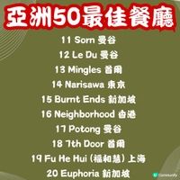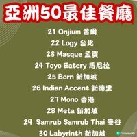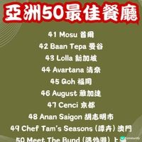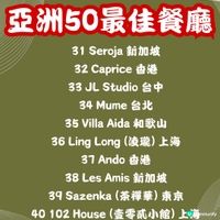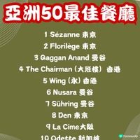 「亞洲50最佳餐廳」(Asia’s 50 Best Restaurants) 結果出爐! 今年上榜餐廳,日本有9間,一於跟住去搵食啦! 想睇完整名單,可以直接由圖11開始睇😋 第一名 ❇️Sézanne 東京 開業短短2年,呢間由星級大廚Daniel Calvert率領既法國菜餐廳,已經係「東京米芝蓮指南2023」中獲評為二星餐廳,更由前年第17名一躍至今既第一名。精緻法國料理更加入了港、日元素,非常有創意~ 📍地址:東京都 千代田区 Pacific Century Place Marunouchi 東京丸之內四季酒店 7樓 🕥營業時間:12-13:30/18:00-20:00 第二名 ❇️Florilège 東京 同樣係「東京米芝蓮指南2023」中獲評為二星餐廳既Florilège,主要提供有日本特色的法國菜,另外有特別既菜單同配酒。 📍地址:Japan, 〒105-0001 Tokyo, Minato City, Toranomon, 5-chōme−10−7 麻布台ヒルズ ガーデンプラザD 2F 🕥營業時間:12-12:30/ 18-18:30 第八名 ❇️Den 東京 以創意懷石料理而聞名,餐廳特別在於主廚喜愛以創新有趣方式包裝日式高級料理。 📍地址:日本東京都澀谷區神宮前 2-3-18 🕥營業時間:12-12:30/ 18-18:30 第九名 ❇️La Cime 大阪 2010開業後兩年便得到米芝蓮,融合亞洲各地材料製成的法國菜,同樣係無菜單由廚師發辦,餐廳裝潢走簡約格調。 📍 地址:大阪市中央區瓦町 3-2-15 🕥營業時間:12-13:00/ 18:00-20:00 第十四名 ❇️Narisawa 東京 多屆入選亞洲50大最佳餐廳,由法式料理主廚成澤由浩開既法國創意料理餐廳,每道菜式擺盤獨特,又充滿美感。 📍 地址:東京都港區南青山 2-6-15 🕥營業時間:12-14:30/ 17:30-20:00 第三十五名 ❇️Villa Aida 和歌山 呢間意大利餐廳位於和歌山既鄉村入面,原因就係因為主廚熱愛大自然,而菜式都以自己種既蔬菜為主,而餐廳亦都係出哂名難book,有興趣慕名一試既朋友就真係睇下你既彩數。 📍 地址:和歌山縣岩出市71-5 Kawajiri 649-6231 🕥營業時間:12-20:00 第三十九名 ❇️ Sazenka (茶禪華) 東京 日本唯一既三星米芝蓮中菜,老闆兼主廚從小便愛上川菜,自此走遍中國台灣香港努力鑽研。 📍 地址:4-chōme-7-5 Minamiazabu, Minato City, Tokyo 106-0047, Japan Address 🕥營業時間:16:00-23:00 第四十五名 ❇️Goh 福岡 主打法日料理,走小餐館的風格。 📍 地址:福岡縣福岡市博多區住吉1-4-17 🕥 營業時間:18:00-00:00 第四十七名 ❇️Cenci 京都 米芝蓮一星意大利日本Fusion菜,餐廳氛圍溫暖,唔少都大讚主廚處理日本菜既技巧👍🏻 📍 地址:京都府京都市左京區聖護院圓頓美町44-7 🕥 營業時間:12-12:30/18-18:30 #UCreator#日本必食#旅行美食#食勻全世界#日本菜#米芝蓮#日本好去處#東京美食#大阪美食#攻略