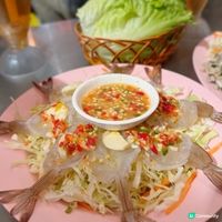 泰式生蝦(晚市$118)同樣用料新鮮,蝦肉彈牙,搭配酸辣泰式汁更加分!烤豬頸肉($98)熟度恰到好處,口感爽脆。