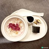 甜品方面,珠光寶盒是一道收藏在珠光寶盒內的甜品,甜品以一串圓球狀呈現,賣相精緻華麗,外層是脆脆開心果白朱古力,內裡則包裹著口感軟滑的開心果雪糕,開心果味香濃同時口感驚喜十足;薑茶湯圓,湯圓內餡香甜,搭配熱薑茶,暖心又暖胃,完美作結。