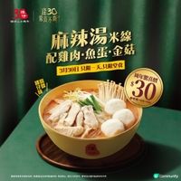 【30周年慶第三彈✨】$30歎「麻辣湯米線配雞肉.魚蛋.金菇」 講到譚仔迷最期待嘅日子,點可以唔提——每月30號😏今個3月30號,可以用$30就歎到「麻辣湯米線配雞肉.魚蛋.金菇」! 招牌麻辣湯底以二荊條、七星椒、子彈頭辣椒再搭配秘製辣椒炮製🌶️,麻香夠勁、辣得過癮~配埋嫩滑雞肉、彈牙魚蛋同爽口金菇,層次豐富,每一啖都勁滿足😋! 30周年唔單只係一個里程碑,更係譚仔同大家一齊走過嘅味道回憶✨ 誠邀各位譚仔迷繼續由呢碗經典麻辣湯米線出發,一齊延續呢份熟悉嘅滋味! 📅 記住:只限3月30日 一日限定 各位譚仔迷,mark實日子,快啲嚟譚仔歎啦🔥 推廣活動期為2026年3月30日,全日供應(早市除外) | 米線不可轉配其他湯底,但可追加其他米線配料,價錢請參閱主餐牌 | 此套餐可享飲品加配優惠 | 以上推廣活動只適用於堂食 | 不適用於手機外賣點餐服務、致電下單、外送平台訂單及所有外賣自取訂單 | 此推廣優惠不適用於$88減$8優惠券或其他折扣券及VIP晚市八折券 | 優惠受條款及細則約束 | 推廣產品及食材數量有限,售完即止 | 圖片只供參考 | 實物及份量可能會有所不同 #譚仔#譚仔雲南米線#啖啖譚仔味#麻辣湯米線配雞肉魚蛋金菇 #我想要麒麟櫻花禮品