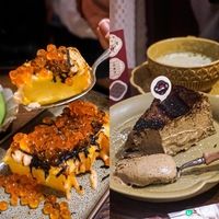 晚市聖誕大餐有齊前菜、主菜和甜品,前菜可選微辣的椒麻生牛肉他他 配炸蓮藕片,或海膽醬刺身魷魚配蒟蒻麵。至於小食三點包括蘆筍芝士海苔卷、紫蘇葉蟹肉天婦羅、流心芝士年糕。主菜有多款選擇,松葉蟹膏甲羅燒飯用上一整隻蟹肉,夠晒足料;壽喜燒汁慢煮牛柳忌廉飯有驚喜,流心蛋跟牛柳完美配搭;日本帶子蝦味噌燴飯鮮味十足,喜歡香口惹味的朋友亦可試串燒羊肉和風炸脆飯 配煙燻紅椒汁。推介鐵板燒三重芝士和牛漢堡飯(+$30),熱辣辣還有澎湃芝士拉絲!牛魔王可試北海道A5和牛肉眼扒 配烤蔬菜(+$50),和牛牛扒肉質粉嫩,油香豐腴。