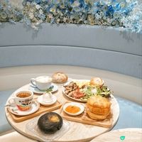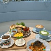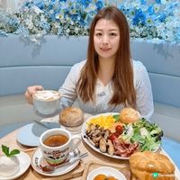 灣仔有好多出名嘅咖啡店 今次揀咗去依間用藍白色主調嘅Cafe 環境好靚 好啱去打卡💙🤍 最signature嘅打卡位就係喺門口嘅樓梯位 有隻大大嘅熊仔 又或者可以好似我咁入去裏面坐 都有一個擺滿花花嘅位置都好靚㗎 素食早餐$128 一上枱真係嚇親 因為好大份 好抵食🥹 有串茄 炒蘑菇 牛油果 沙律菜 仲可以揀要迷你bagel或者Sourdough 最鍾意佢喺個乳酪配上 穀物脆脆同焦糖香蕉😍 清爽無負擔嘅配搭 明太子海膽汁蟹肉意粉$148 蟹肉嘅份量非常之足夠 明太子同海膽味 都食到 唔會比其中一樣搶咗 意粉口感又夠煙靭 😋 港式奶茶焦糖燉蛋$88 俾佢嘅外型吸引咗 用黑白淡奶奶茶杯去裝住焦糖燉蛋 港式奶茶味好濃郁 仲有一層焦糖脆脆 整體唔會太甜 食落又夠滑身 不過每日限量發售 見到記得要試下 Matcha Latte$54 抹茶味好濃 奶泡打得好細滑 Flat White$44 咖啡主調係nutty嘅味道 都幾balance 牛奶嘅香味都仲留到 甜感得唔錯 帶少少雲呢拿嘅香氣 整體嚟講環境都幾舒服 餐點味道好食 份量都好夠🫶🏻 #月餅的季節