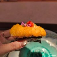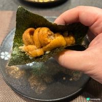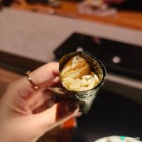 最多人推介就是芝士壽司,在烤紫菜片上包裹紫蘇壽司飯,再夾上厚切拖羅和卡芒貝爾芝士,經備長炭灸燒的拖羅帶有焦香,一咬下去,拖羅的油脂和入口即化的芝士非常配!