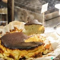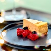 甜品有巴斯克芝士蛋糕配雲呢拿醬,主廚會席前撒上砂糖再用火槍燒至焦糖表面,而巴斯克芝士蛋糕質地軟滑不會太甜,大家可以自己倒入雲呢拿醬調節甜度。