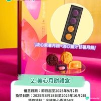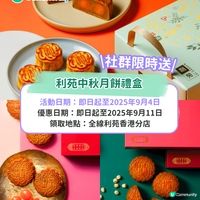 一年容易又中秋,中秋節最重要就係食月餅團團圓圓!除咗食雙黃白蓮蓉、五仁月餅之外,坊間亦流行好多打破傳統嘅新式月餅。由冰皮月餅至榴槤月餅,有啲包裝甚至識發光,全部都大受歡迎!今年嘅月餅禮盒梗係要早買早享受,今日小編就整合咗一系列2025月餅早鳥優惠,仲煩緊買邊隻月餅嘅您一定要bookmark低啦! — — — — — 【請您食月餅】送您利苑/美心精選月餅禮盒! 中秋將至,想令團圓滋味升級,U Community社群幫到您!今個中秋,社群將會送出多個人氣品牌月餅禮盒,包括利苑人氣之選—「雙聚嚐月禮盒」及美心全新「流心紫薯甘薯月餅禮盒」!現時只需簡單登記,就有機會免費帶佢哋返屋企,同家人一齊開心 #雙聚嚐月 啦! {{hket:url-hyperlink display=">登記贏走利苑月餅禮盒<"}}https://ulapp.hk/jyjs1{{/hket:url-hyperlink}} {{hket:url-hyperlink display=">我想收免費美心月餅禮盒<"}}https://ulapp.hk/8qpya{{/hket:url-hyperlink}} — — — — — 中秋月餅推介2025|1️⃣ 利苑中秋月餅禮盒 今年中秋節,利苑誠意推出共七款星級月餅禮盒:開心果五仁月餅、精選月餅禮盒、雙聚嚐月禮盒、迷你流心奶黃月餅、迷你軟心陳皮紅豆月餅、雙黃白蓮蓉月餅及雙黃蓮蓉月餅。利苑於香港自設餅房,保證100%香港製造! 社群今次就聯同利苑為您送上人氣之選—「雙聚嚐月禮盒」,一盒有齊「迷你流心奶黃月餅」及「雙黃白蓮蓉月餅」,今年嘅迷你奶黃月餅更升級至流心餡料,口感及層次更突出!現時只需簡單登記,即有機會免費帶返屋企同家人一齊 #雙聚嚐月! 而且於U Lifestyle App領取獨家電子優惠碼,於利苑網店入手各款月餅禮盒更可享88折優惠,優惠至9月11日,手快有手慢無! {{hket:url-hyperlink display=">領取優惠碼<"}}https://ulapp.hk/vol8h{{/hket:url-hyperlink}} 優惠日期:即日起至2025年9月4日 領取地點:全線利苑香港分店 {{hket:url-hyperlink display=">登記贏免費利苑月餅禮盒<"}}https://ulapp.hk/jyjs1{{/hket:url-hyperlink}} — — — — — 中秋月餅推介2025|2️⃣美心月餅禮盒 食咗太多年雙黃白蓮蓉月餅,想試新口味月餅?今年美心月餅為大家呈獻全新流心紫薯甘薯月餅禮盒,一盒4件分別有流心紫薯月餅及流心薑汁甘薯月餅兩款。月餅採用紫薯蓉配搭紫薯粉!另一款流心薑汁甘薯月餅則以薑汁、子薑及老薑粉調配出薑汁流心內餡,重現港式懷舊風味!即日起至9月2日,簡單登記就有機會贏得U Food X 美心流心紫薯甘薯月餅禮盒啦,送禮自用都好適合! 優惠日期:即日起至2025年9月2日 換領日期:2025年8月18日至2025年10月2日 領取地點:全線美心香港分店 {{hket:url-hyperlink display=">登記贏美心流心紫薯甘薯月餅禮盒<"}}https://ulapp.hk/8qpya{{/hket:url-hyperlink}} — — — — — 中秋月餅推介2025|3️⃣榮華中秋月餅禮盒 榮華今年踏入75周年,延續去年大受歡迎嘅「月映未來」系列(優惠價HK$130/盒),今年全新推出「紫薯麻糬月餅」,麻糬控及紫薯控一定要試下!紫薯柔和清甜,配搭軟糯Q彈麻糬,回味無窮;另外榮華經典「蛋黃白蓮蓉月餅」內含原隻蛋黃,想保持傳統好味道一定要入手。禮盒一盒4件裝,設計別緻簡約,送禮夠曬體面! 優惠日期:即日至2025年9月6日 領取地點:全線榮華香港分店 — — — — — 中秋月餅推介2025|4️⃣奇華餅家迪士尼月餅禮盒 迪士尼粉絲今年又有主題月餅可以入手啦!奇華餅家今年分別新出咗迪士尼米奇與好友系列Head in the Clouds燈籠月餅禮盒及順應熊貓經濟,推出熊貓月餅禮盒!一盒6個裝迪士尼月餅禮盒只需HK$288,包括:蛋黃豆沙月餅、五仁果子月餅及蛋黃純白蓮蓉月餅,全部迷你款,連2個發光燈籠。而且仲可以單個咁買,收藏價值拉滿!特別在於佢個禮盒設計係可以亮燈,夜晚熄燈配埋精緻燈籠根本超夢幻,射中萬千少女心! 換領日期:即日起至2025年10月6日 領取地點:銅鑼灣利園山道33號地舖 {{hket:url-hyperlink display=">即刻等 “frostiewithfood” 同您開箱奇華餅家月餅禮盒<"}}https://ulapp.hk/ahv19{{/hket:url-hyperlink}} — — — — — 中秋月餅推介2025|5️⃣帝一榴「榴槤3重奏」中秋禮盒 中秋節一定係榴槤控最期待嘅節日,因為又有理由可以食榴槤月餅啦~~今年都一定要入手返一盒Dking帝一榴「榴槤3重奏」中秋禮盒,甚至係馬來西亞國家級指定招呼貴賓品牌,一輕鬆歎100%貓山皇或馬來西亞黑刺榴槤果泥製成嘅純手工月餅,口感豐富!一盒4個月餅連4個麻糬,早鳥優惠一盒只需HK$318就食到國家級榴槤月餅,超值得! 換領日期:2025年9月18日至2025年9月30日 領取地點:詳情睇帝一榴官網指定換領點 {{hket:url-hyperlink display=">等 “Lin” 分享榴槤3重奏禮盒心得<"}}https://ulapp.hk/c7207{{/hket:url-hyperlink}} — — — — — 中秋月餅推介2025|6️⃣綠庭園月餅禮盒 食嚟食去都係大牌子,今年想發掘下寶藏小店嘅您注意!今次介紹嘅綠庭園Jardin Europeen係一間網店,唔單止有供貨比好多間星級酒店同蛋糕店,連主理人黎嘉明大師都係五星級酒店大師出身,實力保證!今年綠庭園共出咗四款口味既月餅:包括流心奶皇、柚子軟心、土鳳梨軟心及斑蘭軟心,分別有6件裝及4件禮盒裝,早鳥優惠低至HK$238,無論您係大家庭或者小家庭都可以買! 優惠日期:即日起至2025年9月15日 領取地點:香港觀塘興業街16-18號美興工業大廈 {{hket:url-hyperlink display=">睇 “Fabrice 嚐味” 開箱綠庭園月餅及食評<"}}https://ulapp.hk/nqshs{{/hket:url-hyperlink}} — — — — — 中秋月餅推介2025|7️⃣ 香港半島酒店嘉麟樓月餅 香港半島酒店嘉麟樓