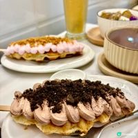 mocha脆脆麻薯窩夫,採用自家製莫卡咖啡醬配上華田脆脆在窩夫面上。