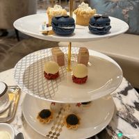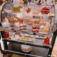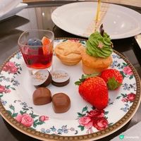 甜品方面則有「香蕉太妃撻」,巧妙地將香蕉的清甜、咖啡的苦味與焦糖的香滑融為一體,打造多元味覺享受。為增添層次感,搭配酥脆的花生香料牛油脆餅和脆花生餡料,再以焦糖花生作點綴,令人一試難忘。「椰棗雲呢拿花」以椰棗和雲呢拿製成的忌廉,創作出玫瑰花的形態。再以雲呢拿海綿蛋糕、雲呢拿甘納許、米布甸和焦糖醬作為甜品的底部,突顯椰棗的天然甜味與雲呢拿的可口柔滑,為清爽秋季帶來絲絲暖意。「玫瑰荔枝花球」,以豐盈軟滑的荔枝慕絲,搭配雜莓夾心的芝士蛋糕及酥皮餅乾,入口絲滑香甜。招牌「開心果紅桑子花」頂層的紅桑子果凍酸甜適中,配香滑的輕開心果香緹忌廉和鬆軟的開心果海綿蛋糕,底層選用開心果牛油脆餅,令人難以抗拒。最後,還有經典新鮮焗製的英式鬆餅,有原味和橙味,配搭傳統凝脂忌廉、士多啤梨果醬和車厘子果醬(時令果醬)。吃到最後,還會有甜品手推車,裏面的甜品都是任吃的,有朱古力、水果撻、馬克龍、布甸和蛋糕等等。