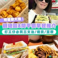 觀塘區美食雲集,由平價街坊小食到高級全日早餐任君選擇!相信喺觀塘返工嘅打工仔最擔心嘅唔係附近冇早餐好食,而係選擇太多難以抉擇!今日小編就整合社群U Creator及街坊推介8間觀塘區早餐餐廳,即刻睇下啱唔啱食啦! ----------------- 【請您試食🍔】Oliver’s Super Sandwiches全新 “Eat to Fit” Menu! 控制體重唔想食得太heavy嘅您望入嚟!邊個話GYM餐一定係食雞胸!Oliver’s Super全新餐單由人氣廚師及營養顧問精心設計,推出主要關注高蛋白、低卡同低GI (升糖指數) 嘅餐單~即日起至11月9日{{hket:url-hyperlink display="簡單登記"}}https://ulapp.hk/1ld04{{/hket:url-hyperlink}},即可免費試食Oliver’s Super Sandwiches全新「Eat to Fit」餐單。有湯飯、沙律、漢堡包等等,絕對要試下! 活動日期:即日起至2025年11月9日 {{hket:url-hyperlink display="> 登記贏走免費健康餐單 <"}}https://ulapp.hk/stim0{{/hket:url-hyperlink}} ----------------- 1️⃣ 永興豆漿王 觀塘街坊熟知嘅「永興豆漿王」於2019年結業,近年喺裕民坊「YM²」重出江湖,觀塘之友們可以品嚐返原味道啦!主要售賣豆腐花、豆漿,亦都有售賣$12/10粒燒賣、魚蛋等地道小食,仲有秘製自家醬料都大受好評,未食過嘅觀塘打工仔不妨去試下呢間觀塘友嘅集體回憶! 地址:觀塘協和街33號裕民坊YM² 1樓裕民里1B10舖 2️⃣ 駿運士多 相信無論係觀塘打工仔定係街坊,都一定聽過「駿運士多」!呢間燒賣店每次見親都排長龍,主打魚肉燒賣同豬肉燒賣,仲有腸粉、粉果等經典港式小食。價錢都係親民價,只需$10就有8粒燒賣,而且大大粒又硬度適中,燒賣控實鍾意! 地址:觀塘觀塘道410號觀點中心地下G02號舖 {{hket:url-hyperlink display="> “大A吃貨組” 分享駿運士多點解咁受歡迎<"}}https://ulapp.hk/qqcmd{{/hket:url-hyperlink}} 3️⃣ 大彥 巧明街一帶有間外表看似低調,實測充滿驚喜嘅餐廳。主打四川冒菜同粢飯,但有齊早餐、經典燒賣魚蛋、西式三文治、糖水應有盡有,可以揀選套餐,或者自由配搭出自己想要嘅組合又得。重點係價錢親民,性價比算高,唔少打工仔放氯或者買早餐都會專程過嚟。不過餐廳入面得幾張枱,想慢慢享受靚早餐就建議外賣啦! 地址:觀塘巧明街107號國基集團中心地下01號舖 {{hket:url-hyperlink display="> “Hungrytreebear” 同您分享大彥點食之選<"}}https://ulapp.hk/dmzgv{{/hket:url-hyperlink}} 4️⃣ 小城大廚 喺觀塘居然有間只需HK$20就食到一碗沙嗲牛肉麵早餐!位於巧明街嘅「小城大廚」除咗係一間中式小炒店之外,佢仲係受打工仔們歡迎嘅早餐大排檔。設有多款經典茶記必備粉麵、三文治套餐,而且最平HK$20就食到粉麵餐,外賣仲有額外9折!就算趕唔切堂食,外賣食仲開心! 地址:觀塘成業街19-21號成業工業大廈地下3號舖 5️⃣ 海潮食堂 提到觀塘著名茶餐廳,呢間「海潮食堂」一定榜上有名!作為觀塘29年老店,連佘詩曼及吳浩康都係佢哋常客!招牌香蔥滑蛋三文治正正就係阿佘最愛,蔥花味道濃郁,配上滑蛋同薄多士鹹甜適中。而且餐廳仲有好多隱藏menu係冇寫低,全靠老板即日發揮,食客幫襯分分鐘會有驚喜,令海潮食堂被街坊稱為「港式omakase」! 地址:觀塘成業街19-21號成業工業大廈地下G6號舖 {{hket:url-hyperlink display="> “WaiWai Ng” 分享海潮食堂用餐體驗<"}}https://ulapp.hk/o137c{{/hket:url-hyperlink}} 6️⃣ 番尋味 觀塘工廈入面有一間高CP值嘅茶記早餐!位於開聯工業中心嘅「番尋味」開業至今20多年,餐點性價比高而且好多選擇!最平HK$25就有一個早晨全餐,有齊粉麵、多士同飲品,價錢十分親民!餐廳仲有安排網上或Whatsapp外賣送貨或自取服務,打工仔食早餐都唔使專程去工廈一趟啦! 地址:觀塘開源道55號開聯工業中心A座2樓28號舖 {{hket:url-hyperlink display=" > 'Dada' 分享番尋味早餐CP值有幾高<"}}https://ulapp.hk/68z0m{{/hket:url-hyperlink}} 7️⃣ 醉香小食雞蛋仔 X 大坑車仔麵 觀塘居然只需HK$20就買到一盒3件嘅三文治!位於駱駝漆大廈地鋪嘅「醉香小食雞蛋仔X大坑車仔麵」除咗售賣雞蛋仔之外,仲有各種醒神早餐,就連三文治都有8款選擇,全部都係HK$20!如果唔想日日都食三文治,仲有台式蛋餅、燒賣、腸粉等小食,加$10仲額外送您飲品,凍飲熱飲同價,種類豐富價錢親民,直接解決早餐煩惱! 地址:觀塘開源道60號駱駝漆大廈第三座地舖 8️⃣ 觀塘日作食堂 想體驗喺日本課室入面用餐,不妨去觀塘工廈入面嘅日作食堂食返餐和式早餐,用美食開啟美好嘅一日。餐廳裝潢簡約,以學生書枱作為餐桌,令食客重拾學生時代回憶。日式特選和風早餐($88)有齊炒蛋、煙肉、芝士腸、沙律、炸忌廉蟹肉餅,仲有乳酪同半份多士等等,咁足料仲要免收加一服務費,可以無限添飲咖啡或茶,當Brunch食都唔錯! 地址:觀塘鴻圖道63-65號鴻運工業大廈地下A號舖 {{hket:url-hyperlink display="> “eatistruelove.hk” 帶您晨早打卡和洋風朝食<"}}https://ulapp.hk/ri2of{{/hket:url-hyperlink}} 🔔 Follow《U Community社群》{{hket:url-hyperlink display="Instagram "}}https://www.instagram.com/ucommunity.hk/{{/hket:url-hyperlink}}同讚好 {{hket:url-hyperlink display="Facebook "}}https://www.facebook.com/UCommunity.hk/{{/hket:url-hyperlink}}專頁 ,睇更多U Creator品牌活動招募丶送禮丶緊貼最新美食丶旅遊打卡熱話或創作者流量密碼教學等。 ----------------- 招募Foodie | 寫食評賺獨家奬賞及品牌合作機會🍜! 立即登記➡️ {{hket:url-hyperlink display="https://ulapp.hk/mp25i"}}https://ulapp.hk/mp25i{{/hket:url-hyperlink}} 圖片來源:網上圖片、香港特許