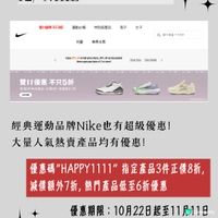 • 雙11正日: 10月31日至11月12日,買滿 $1,111 即享 89折 (折扣無上限);另有 $11/$111 特價專區。