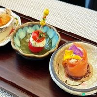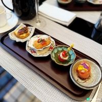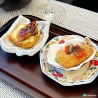 4款前菜包括煙燻三文魚玫瑰卷配 GODIVA 朱古力粉、迷你芝士波伴櫻桃蕃茄、香脆炸生蠔和蛋慕斯照燒鰻魚配法國牛油包。其中炸生蠔特別配上GODIVA 朱古力蛋黃醬,朱古力的香醇中和了蛋黃醬的酸味,非常配搭。