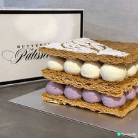 超正拿破崙蛋糕好介紹!嚟自Rosewood瑰麗酒店Butterfly Patisserie,拿破崙酥皮香脆可口,配上雲呢拿拼香芋嘅custard cream,非常幼滑,好夾,要買嚟比屋企人朋友生日! #步步糕升