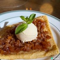 面層焗至金黃色的蘋果片,內裏是香甜蘋果餡;相比英式蘋果批的死甜,這款蘋果批吃落清爽不膩。
