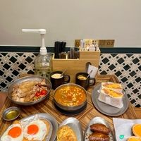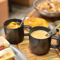 蘭王太陽蛋笑牛牌芝士火腿西多士 🍞 蘭王蛋的橙紅蛋液濃稠,看著蛋漿流出,實在太療癒了!配鹹香的芝士,再疊加糖漿,「鹹甜西多」層次更高,不能錯過!! 蕃茄牛尾湯本地牛肉通粉🍅 牛尾湯底濃稠度足,配上自家製餐包吸滿湯汁,好滿足😍😍😍 酥皮蘭王蛋撻 🥚 酥皮層次分明,竟然用了蘭王蛋,蛋芯質地像燉蛋般滑溜,蛋味濃郁❤️❤️❤️ 茄汁燴意粉🍝 可以自己選配不同配料,配料相當豪華!北海道無激素雞扒皮脆肉嫩,加厚切餐肉邪惡但口感十足。滿滿港式情懷,酸甜又醒胃👍🏼👍🏼 蘭王雞蛋多士 🥪 蘭王蛋配上港式經典厚切餐肉後飽腹感極強! (辣)威水雞翼 惹味小食,辣度適中,是很好的小食🤤🤤🤤 熱威鋒咖啡☕️ 店家的招牌咖啡,啡味較重,正好平衡餐點的油膩感 熱檸茶🍋 熱檸茶更能帶出紅茶的醇厚香氣,要消化這頓早餐非他莫屬了 每款食物有個人化選擇,例大火小火烹煮,茶味的濃淡,特別又個人化,可以針對自己口味調整,加分👍🏼👍🏼👍🏼👍🏼
