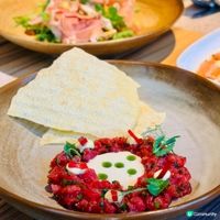 這家新開業的意大利餐廳由一位曾效力城中幾家名店的大廚開設,採用優質材料入饌,寬麵及細扁麵都是自家手工鮮製,價錢卻相當親民。平日精選午餐最平$88起,周末早午餐每位$168起,提供前菜、主菜及甜品,主菜有超過十種選擇,相當豐富。 主廚Bhupendra Singh 曾先後於希爾頓酒店、洲際酒店、Bread Street Kitchen、Duck & Waffle和米芝蓮星級餐廳Fiamma等多家著名食府磨練技藝,融會貫通各國料理,演變出獨門的烹調風格,以匠心呈現傳統經典意式風味。餐廳室內設計靈感源自羅馬小餐館,超高樓底配上落地玻璃盡顯氣派,半開放式廚房可一睹大廚製作Pizza的過程。 𓌉◯𓇋 Set Brunch 𓌉◯𓇋 ($168 per person) ✦ Starters to Share ✦ ✾ Parma Di Prosciutto 18個月風乾火腿份量毫不吝嗇,火箭菜為火腿的鹹香帶來平衡,梨蓉和榛子添加了果香和堅果風味。 ✾ Burrata🧀 柔軟水嫩的布拉塔芝士奶香十足,配上橄欖、印加車厘茄及意大利西蘭花苗,再以羅勒碎及特級初榨橄欖油調味,輕盈清新。 ✾ Salmon Carpaccio🍣 三文魚肥美鮮甜,配上芥末蛋黃醬,鮮味更上一層樓。 ✾ Steak Tartare (+$88/pp)🥩 生牛肉他他擺盤精緻,與醃紅蔥頭、帕爾瑪芝士醬及芥末蛋黃醬拌勻,再塗抹在薄脆片上,軟滑與香脆的口感交織出美妙滋味。 ✦ Main ✦ ✾ Rigatoni All’Amatriciana🍝 粗管通粉煮得軟硬適中,紅醬基底加入煙豬面頰肉帶出醇厚滋味。 ✾ Pizza Prosciutto e Bufala (+$68)🍕 手工意大利薄餅即叫即製,邊緣烤得焦脆,餅底鬆脆兼富小麥香。鋪上拉絲水牛芝士及風乾18個月帕爾瑪火腿,鹹香惹味。 ✾ Veal Milanese (à la carte $298)🥩 米蘭小牛肉扒裹上意式麵包糠炸成,配搭雜菜沙律、百里香蛋黃醬和檸檬,還原地道風味,但整體口感比較乾硬。 ✦ Desserts to Share ✦ ✾ Tiramisu 🍰 提拉米蘇做法相當正宗,瑪斯卡邦尼芝士口感軟滑,手指餅浸得夠濕潤,咖啡味和酒香平衡得宜。 ✾ Cheesecake🧀 採用意大利軟芝士製成,口感比一般紐約芝士蛋糕輕盈。配搭新鮮莓果及香脆的蛋白餅,口感豐富。 ◦•◦♡.﹀﹀﹀.♡◦•◦♡.﹀﹀﹀.♡◦•◦♡.﹀﹀﹀.♡◦•◦ 𖠿 Osteria UNO @osteriaunohk 𖤣𖤥 大角咀櫻桃街38號西九匯地下G08-G11號舖 ◦•◦♡.﹀﹀﹀.♡◦•◦♡.﹀﹀﹀.♡◦•◦♡.﹀﹀﹀.♡◦•◦ 💕喜歡我的分享,記得follow我IG:@peggie.dailylife #OsteriaUNO#大角咀美食#新餐廳#意大利菜#西餐#手工意粉#薄餅#italiancuisine#pasta#pizza#cheesecake#brunch#lunch#打卡餐廳#香港美食#香港探店#美食推薦#香港打卡#香港好去處#UCreator