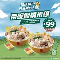 有啲優惠,見到就應該即刻約人!4月13–19號,嚟譚仔用APP叫兩碗過橋米線,只係$99,如果你已經解鎖VIP尊享優惠*🔓,用埋晚市8折優惠就直接$79兩碗,一人一碗,價錢仲平過平時一碗…🤤 仲可以順手升級幸福感,加配飲品或小食(1人份量)👇 +$11加杯錫蘭紅茶底凍檸茶🍋 +$12加配 紅油木耳或紅油青瓜 +$14加配 四川青椒皮蛋或麻辣豬耳 *VIP晚市八折優惠只適用於譚仔APP VIP會員 | 於譚仔APP成功註冊為會員並於連續90天累積消費滿HK$600,即可於翌日自動解鎖VIP 晚市八折優惠時段 | 折扣後的總價格如有小數位將以四捨五入至最近整數處理 | 推廣期為2026年4月13日至4月17日下午3時後供應,2026年4月18日至4月19日全日供應 (早市除外) | 優惠只適用於手機點餐之堂食及外賣自取服務 | 外賣包裝每個將收取1元 | 產品供應數量有限,售完即止 | 優惠詳情請參閱譚仔手機應用程式內資訊 | 優惠受條款及細則約束 | 圖片只供參考 | 實物及份量可能會有所不同 #我想要麒麟櫻花禮品