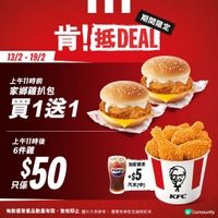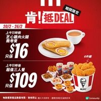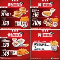 由2月13日至3月5日期間,連續三個星期為你送上多款肯!抵DEAL,全日都歎盡KFC滋味!😋 第1️⃣周 - 2月13日至2月19日 🌅上午11點前 — 家鄉雞扒包買一送一 🕚上午11點後 — $50 6件雞*,可享$5加配汽水(中)優惠 ! 第2️⃣周 - 2月20日至2月26日 🌅上午11點前 — $16 芝心雞肉火腿脆卷餐 🕚上午11點後 — $109 超值三人餐,套餐包括6件雞+2客辣汁蘑菇香飯(普通)+家郷雞皇飯(普通)+3件經典葡撻+粗薯條(普通)+3杯汽水(中) 第3️⃣周 - 2月27日至3月5日 🌅上午11點前 — $20 香蔥家鄉雞粒粥/香蔥雞絲粥配熱飲,仲可以以$6加配香脆油炸鬼 🕚上午11點後 — $49 12件巴辣香雞翼,亦可享$5加配汽水(中)優惠 ! 各位🍟薯條fans留意📢 2月13日至3月5日: 🕚上午11點後 —🍟 $5粗薯條(普通) 配芝士FING FING粉 你都可以用1,000 yuu積分兌換添💁♂️ 點可以錯過!落單㩒呢度:https://bit.ly/4aVvVdX *雞件口味可選擇(家鄉雞/香辣脆雞/狂惹香燒雞) #KFCHK#肯抵deal#優惠 #限時優惠#優惠 #精緻茶聚#UCreator #好去處 #打卡 #甜甜蜜蜜過新年#ucreatorhk #ucreator#momentswithucreator#2025Chillguy#bestfoodwithucreator#人人生日快樂#我係咖啡達人#我想同您試飲蘋果玉桂蜂蜜酒#我想食buffet 條款及細則︰ -優惠期由2025年2月13日(四)至3月5日(三),各優惠數量及供應期有限,售完即止。 -只限堂食及外賣自取,不適用於快脆送。 -不可與套餐加配美食優惠同時使用。 -不可兌換現金及不可與其他優惠同時使用,包括不可賺取yuu 印花。 -優惠適用於香港肯德基餐廳 (不適用於亞洲國際博覽館分店)。 -家鄉雞扒包買一送一優惠不適用於赤柱廣場、九龍塘又一城及啟德體育園分店。 -$16 芝心雞肉火腿脆卷餐不適用於旺角山東街、赤柱廣場、九龍塘又一城及啟德體育園分店。 -$20香蔥家鄉雞粒粥/香蔥雞絲粥配熱飲優惠不適用於旺角山東街、九龍奧海城二期、觀塘東廣場、赤柱廣場、彩雲商場、九龍塘又一城、西灣河太安樓、金鐘海富中心及啟德體育園分店。 -旺角山東街分店不提供狂惹香燒雞。 -$109超值三人餐優惠不適用於旺角山東街分店。 -$5粗薯條(普通)配芝士FING FING粉優惠不適用於旺角山東街分店。 -$5粗薯條優惠固定配搭為芝士FING FING粉,不設更改。 -$20香蔥家鄉雞粒粥/香蔥雞絲粥配熱飲優惠可另享加配香脆油炸鬼優惠,每次最多可加配2條香脆油炸鬼。 -$50 6件雞優惠及$49 12件巴辣香雞翼優惠可另享加配汽水(中)優惠,每次最多可加配3杯汽水。 -金鐘海富中心、西灣河太安樓及觀塘東廣場分店以罐裝汽水取代杯裝汽水。 -2025年2月13日至2月19日期間,買一送一優惠之家鄉雞扒包(單買)價格一律訂定為$24.5。 -口味供應及雞件部位配搭由各KFC分店實際情況及供貨而定。 -食品供應及價格以各餐廳之訂定為準。 -圖片只供參考。 -有關「以1,000 yuu積分兌換粗薯條 (普通) 配芝士FING FING粉」的條款及細則,請參閱yuu 應用程式中之相關獎賞兌換頁面。 -如有任何爭議,Birdland (Hong Kong) Limited 保留最終決定權。