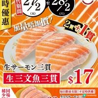 壽司郎$17三文魚三貫快閃優惠!一連兩日(2月27日及28日)推出生三文魚三貫破底價優惠,只需 $17 就可以歎到加量不加價的肥美三文魚!同場更有神出鬼沒的隱藏版三文魚腩三貫!此外,備受追捧的「米芝蓮一星主廚聯乘系列」第2彈亦已強勢登場,$22就食到星級足料壽司,即睇今個週末壽司郎必食攻略!
