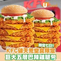 唔係愚人節活動!KFC今次真係限定七日推出巨大五層巴辣雞腿包,有齊5層爆脆巴辣雞扒、濃香芝士、番茄生菜,只需$88就可以挑戰巨型burger+薯格+汽水,+$1再多一杯汽水! -適用於上午11時後 -全線香港分店供應 (亞洲國際博覽館、赤柱廣場、 又一城、置富南區廣場除外) -圖片只供參考 -只限於堂食供應 -數量及供應期有限,售完即止 -賺取20x yuu積分優惠適用於2026年3月16日至2026年3月22日。賺取20x yuu積分優惠只適用於惠顧巨大5層巴辣雞腿包套餐,但不適用於同一筆消費中的其他食品或產品,包括加配美食優惠(如:「加配滋味」或「限定加購優惠」)。