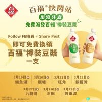 【免費派發百福®樽裝豆漿🥛】 全新登場嘅百福®樽裝豆漿,豆味香濃、入口順滑😋,最緊要係不添加防腐劑、0毫克膽固醇^,仲有原味同低糖配方兩款選擇,飲得安心又健康💪🏻!全新樽裝設計輕便易拎,常溫保存都得👌🏻,隨時隨地扭開就飲到新鮮營養,返工、返學、出街帶住超方便😉! 想親身試吓呢份隨時隨地嘅滋味🤩?百福®將於3月喺唔同地方舉辦快閃站💁🏻,只要做足以下步驟就可以換領到百福®樽裝豆漿一支,等你可以帶住營養繼續出發✌🏻: ✅ LIKE 百福豆品Facebook專頁並轉發指定貼文即送百福®樽裝豆漿一支 📍推廣日期及地點: 3月19日(星期四) 12nn-7:30pm:鰂魚涌 康橋大廈對出位置 3月20日(星期五) 12nn-7:30pm:觀塘 駿業里 3月21日(星期六) 12nn-6pm:旺角 朗豪坊 (近松本清) 3月22日(星期日) 12nn-6pm:銅鑼灣 百德新街 (近H&M) 3月27日(星期五) 12nn-7:30pm:九龍灣 偉業街 3月28日(星期六) 12nn-6pm:沙田 港鐵站 3月29日(星期日) 12nn-6pm:將軍澳 Popcorn對出位置 活動條款及細則:https://bit.ly/3N0c4mv #百福豆品#百福#PakFook{{hket:campaign display="社群三月快閃送"}}{{/hket:campaign}} #免費派發 #快閃站#著數報料 #百福樽裝豆漿
