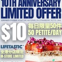 LIFETASTIC推出$10蛋糕優惠回饋顧客,與大家一起慶祝十週年,於全線門市成功追蹤「@lifetastic.official」Instagram帳戶,每日下午2點或之後,向店員出示手機畫面,即可以$10買招牌草莓西瓜蛋糕一件,每日數量有限,送完即止。