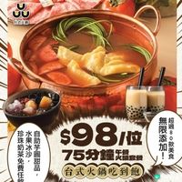 牛品台式火鍋推出$98火鍋放題,指定時段人均$98起,即可任食任飲75分鐘,兩位或以上即享$98放題優惠,一位享用須另加$20,有超過80款火鍋配料,包括美國牛胸腹、頂級牛板腱、花雕醉雞、蜂巢豆腐、花枝丸、蔬菜等,再加芋圓、冰沙、珍珠奶茶等自助美食!